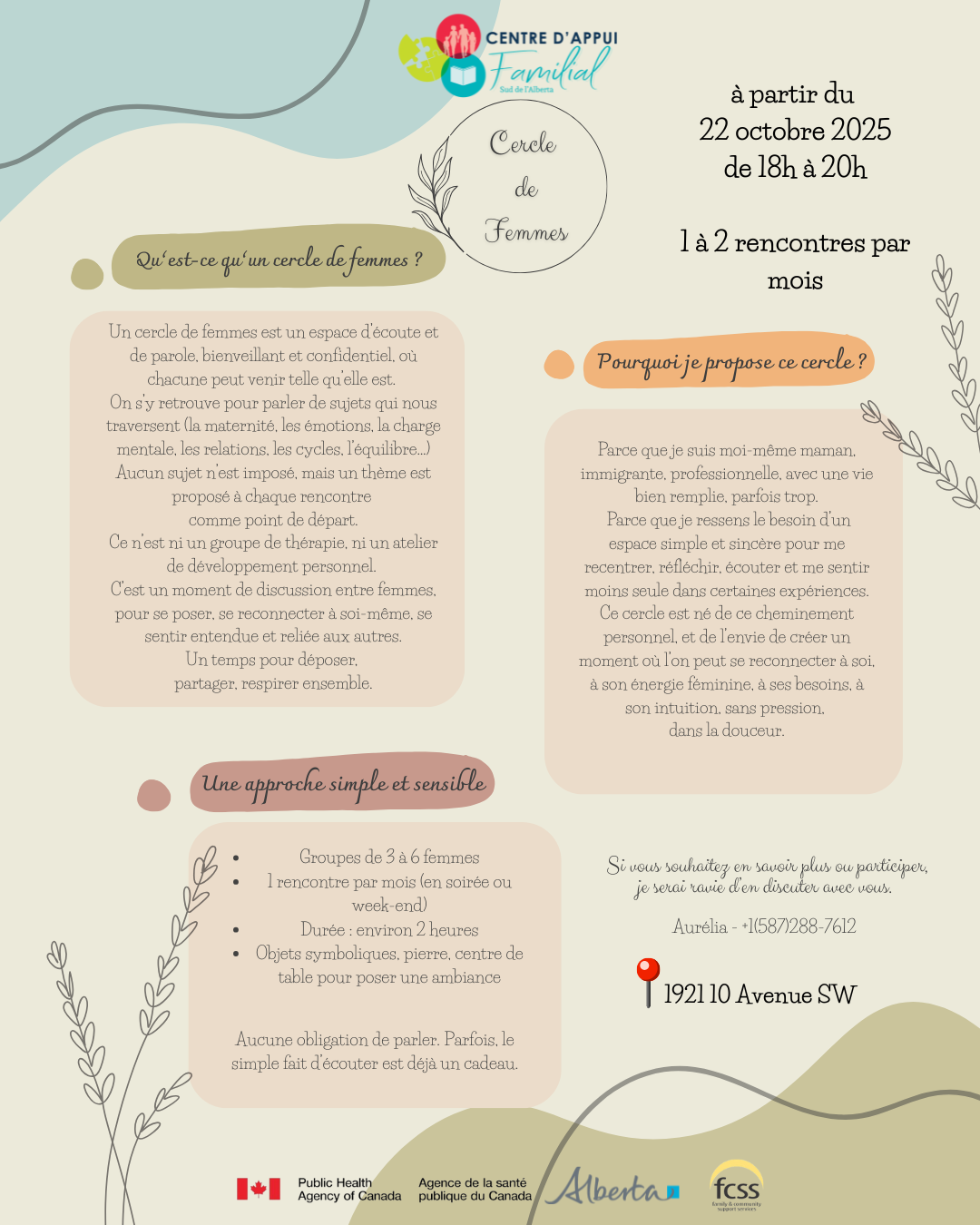 Rejoignez-nous pour un moment unique de partage et d’écoute lors de notre premier Cercle de Femmes, qui aura lieu le 22 octobre à 18h.