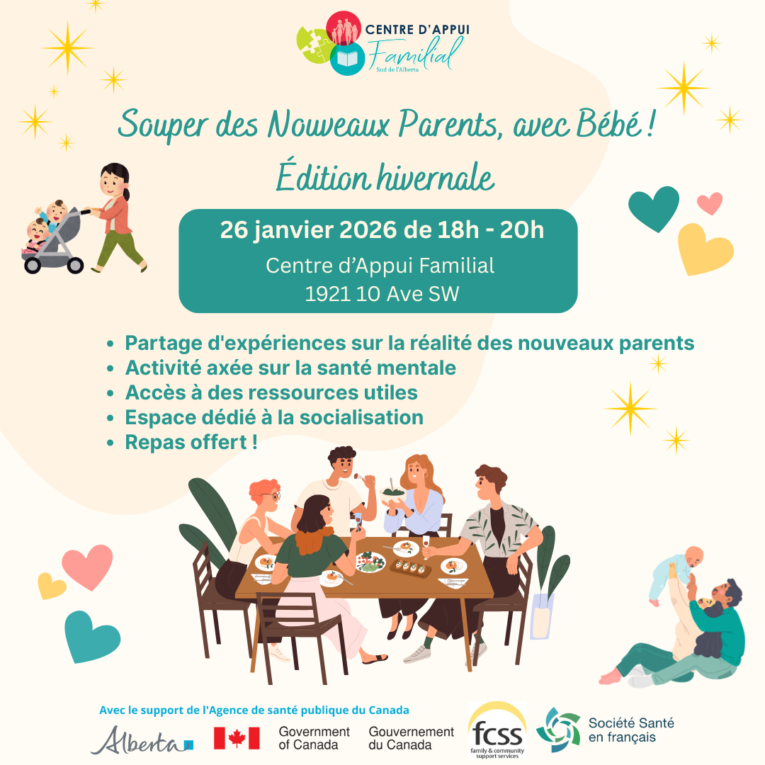 Ce souper sera l’occasion de tisser de nouveaux liens avec d’autres nouveaux parents. Il sera aussi l’occasion de découvrir les ressources que nous offrons et rencontrer nos intervenantes.